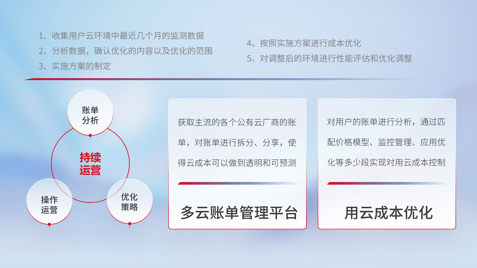 通过多云纳管,,,以统一的资源数据模型把客户的云资源进行抽象和封装,,,进而实现对多云资源的统一操作,,,保障云资源管理的可靠性、、稳定性与可用性。。量身定制化运维内容,,,配置、、、开发运维、、补丁管理、、、、备份、、、、监控、、认证和访问管理、、审计和日常巡检等,,,,保障在用云过程中的可靠度,,稳定度以及高可用率。。。。