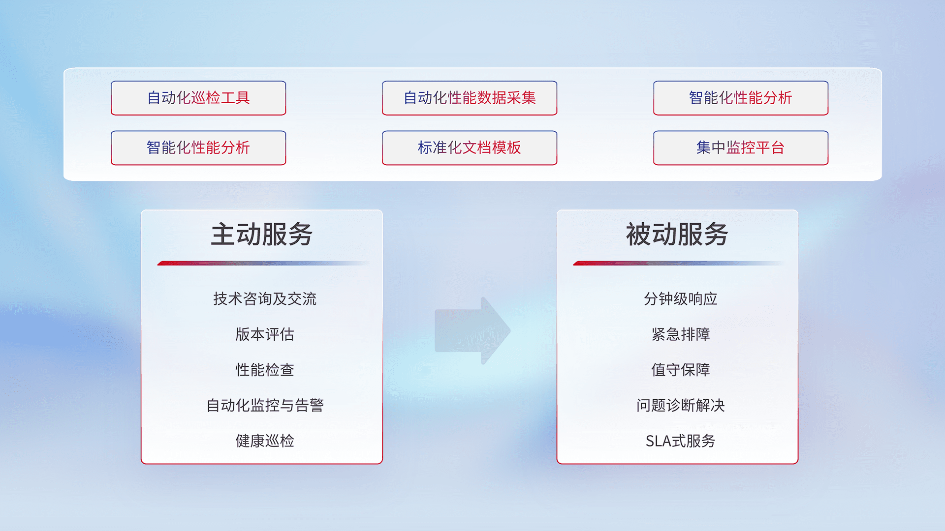 智能化工具和标准化文档,,保障服务质量,,提供主动服务(包含技术咨询、、、版本评估、、、性能检查、、、、自动化监控与告警、、健康巡检)和被动服务包含(分钟级响应、、紧急排障、、值守保障、、、问题诊断解决、、、SLA服务)。。。