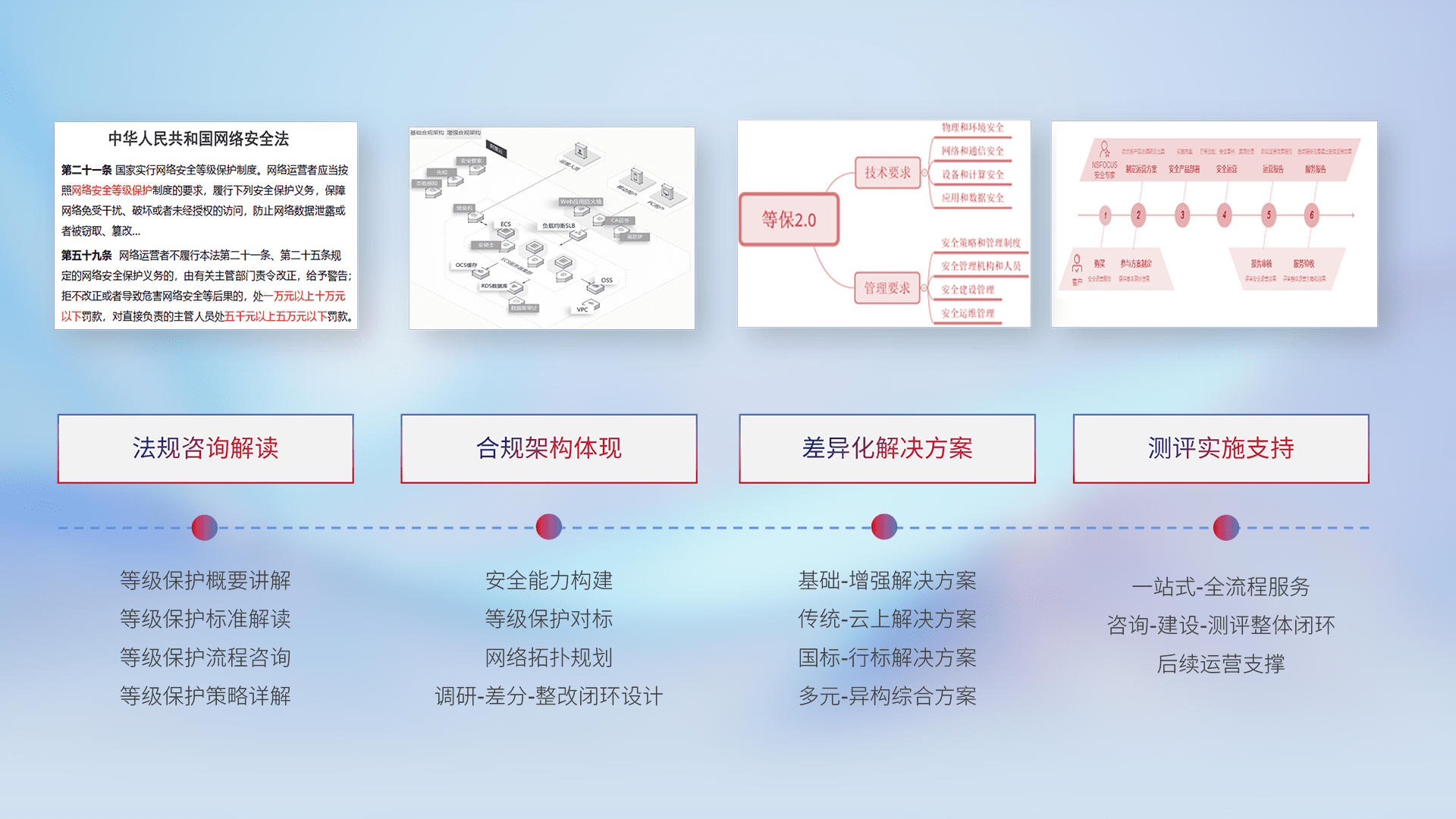 通过专业的法律咨询解读、、、合规架构体现、、、差异化解决方案、、、、测试实施支持等服务,,为客户量身打造等保合规体系。。